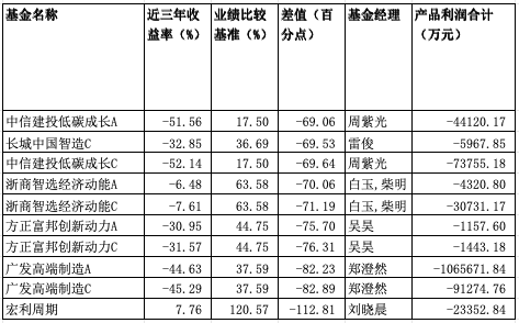 排名后10位的分别是:中信建投低碳成长A、长城中国智造C、中信建投低碳成长C、浙商智能选经济动能A、浙商智选经济动能C、方正富邦创新动力A、方正富邦创新动力C、广发高端制造A、广发高端制造C、宏利周期。它们分别跑输业绩比较基准69.06个、69.53个、69.64个、70.06个、71.19个、75.7个、76.31个、82.23个、82.89个、112.81个百分点。